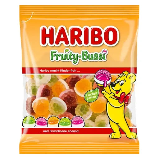 Haribo Fruity Bussi Herrlich weicher Schaumzucker mit Fruchtfüllung! Ganz ohne künstliche Farbstoffe! Also von Natur aus schön und lecker!