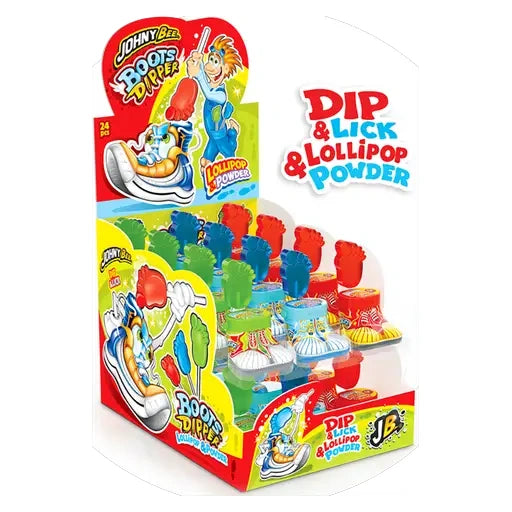 Johny Bee Boots Dipper und du lebst auf dem großen Fuß. Dieser verrückte Lutscher zum Dippen läuft dir garantiert nicht weg. Denn es ist so einfach und so lecker. Dose öffnen und den anebrachten Lolly in das Pulver eintauchen. Und schon ist die Geschmackexplosion in deinem Mund. In den Geschmacksrichtungen Erdbeer, Himbeer und Apfel. Also was willst du? Alter Schuh? Oder diese verrückten Boots?