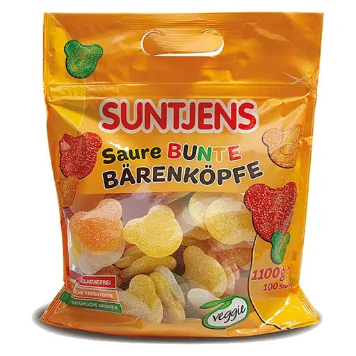 Suntjens saure bunte Bärenköpfe sind saure Fruchtgummis in Form von Bärenköpfen. Natürlich ohne tierische Gelatine und somit komplett vegetarisch. In verschieden Farben und Geschmacksrichtungen. Ohne künstliche Aromen und Farbstoffe dürfen sie in keinerm Süßigkeiten Regal fehlen. Jetzt bestellen!
